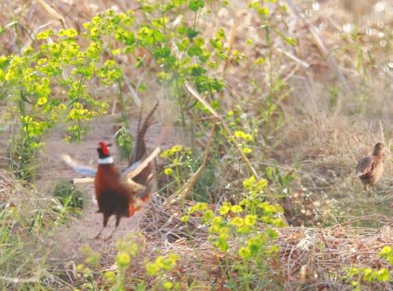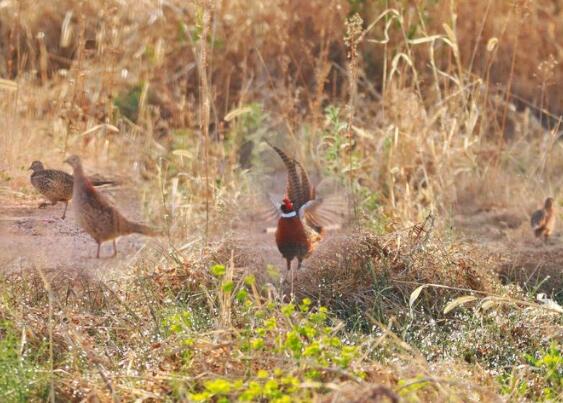 2.狩猎野鸡最好的季节是秋冬季。天一亮太阳还没出来,野鸡就开始出现,这个时候,野鸡藏身之处甚少,不得不在视野开阔的空地上觅食,有时老远就能看见。