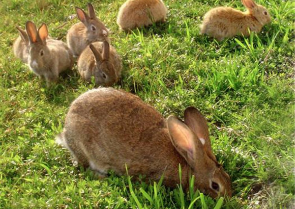 食谱:野兔以野草、树叶等植物为食,人工养殖饲料来源广泛、各种牧草、青菜、秸秆等均可喂养,一般早、中餐喂青饲料和多汁饲料,晚上喂青饲料和少量颗粒饲料。